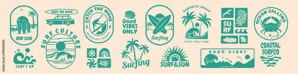 Retro surf club badge collection with ocean waves, palm trees, and tropical sun. Vintage vector emblems for t-shirt prints, beachwear design, summer logos, and coastal branding projects. #1950069610