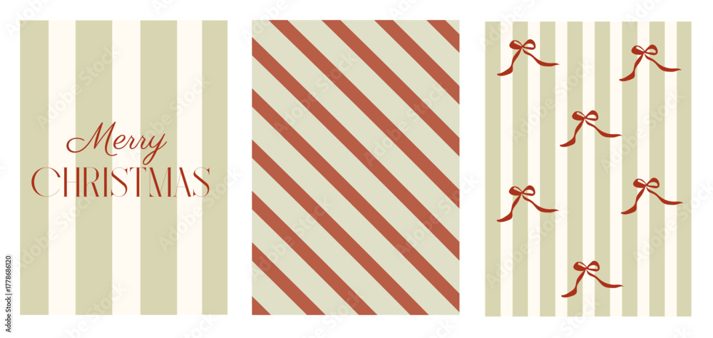 Retro whimsical Christmas backgrounds set with vertical, diagonal, and bow stripe designs. Vintage holiday card templates, wrapping paper, and festive graphic decor in playful classic style. #1778686120