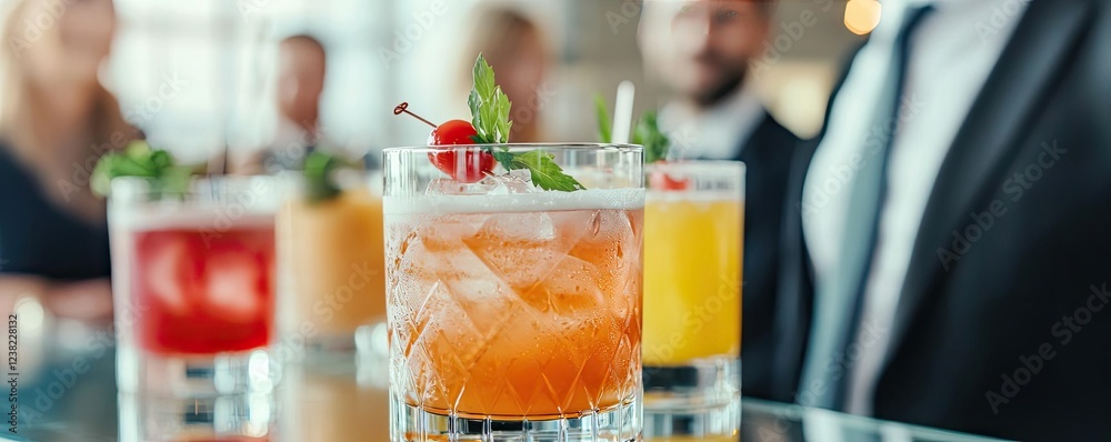 Reunion party idea. Colorful cocktails served in elegant glasses at a modern bar setting. #1238228132