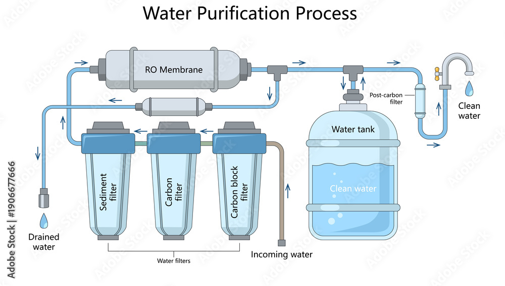 reverse osmosis water purification process with labeled filters, clean water tank, and flow directions diagram hand drawn schematic raster. Science educational illustration #1906677666