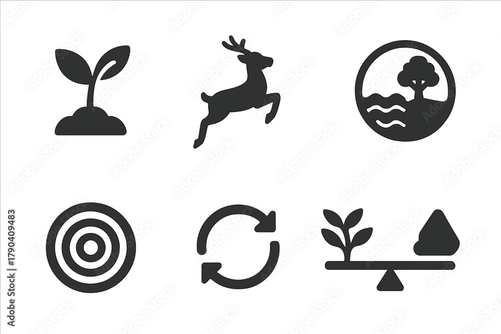 Rewilding Icons. Solid style icons of rewilding efforts in fallout zones: plant sprout glyph, animal return icon, ecosystem badge. #1790409483