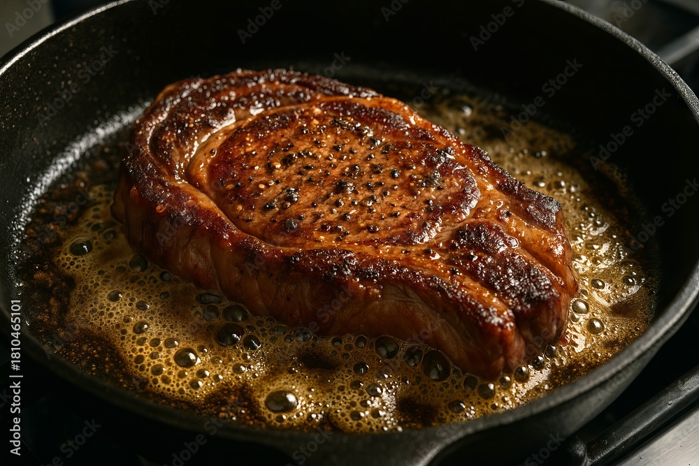 Ribeye steak cooking in a cast iron pan with butter. Delicious beef fry in hot oil for dinner. Sizzling meat in a home kitchen. #1810465101