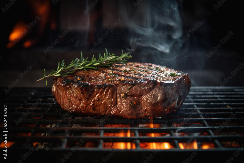 Rindersteak Rumpsteak auf Grill mit Flammen. Generative Ai. #582435752