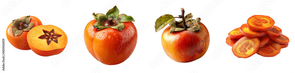 ripe persimmons whole sliced orange fruits fresh on transparent background #1650436459