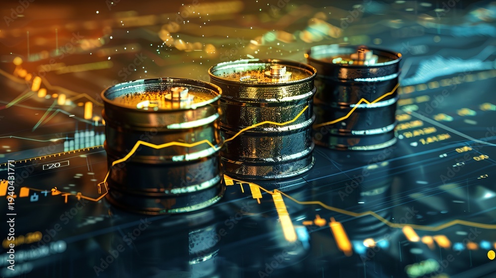 Rising oil prices illustrated by overlapping oil barrels and stock market chart background #1940431771
