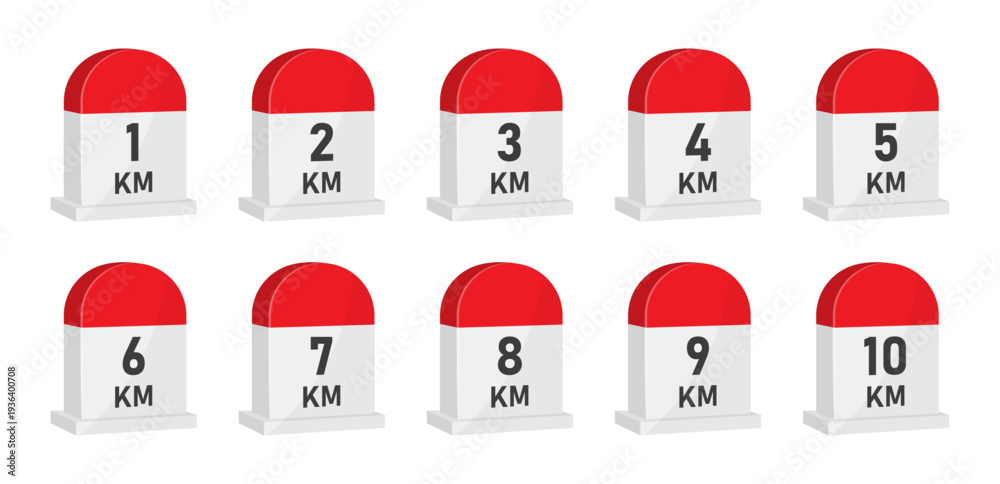 Road distance milestone markers set 1 to 10 km, Red and white kilometer stones for navigation route marathon distance indicator vector illustration #1936400708