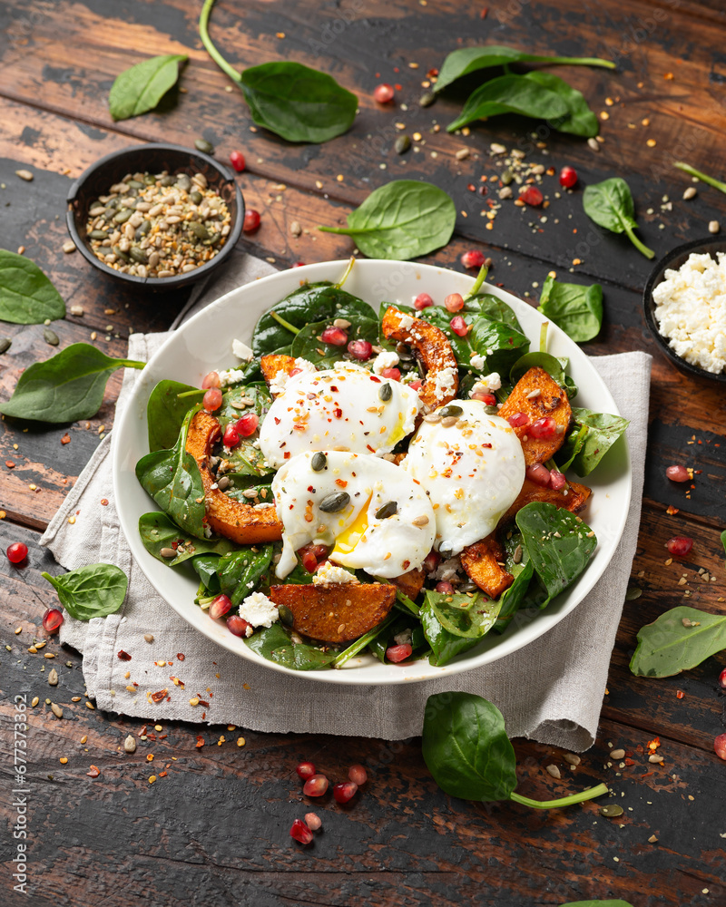 Roasted butternut squash salad served with poached eggs, spinach, nuts and pomegranate seeds #677373362