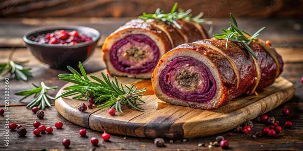 Roasted meat roulade with vibrant purple vegetable filling, garnished with fresh rosemary sprigs and peppercorns on a rustic wooden board #1210233360