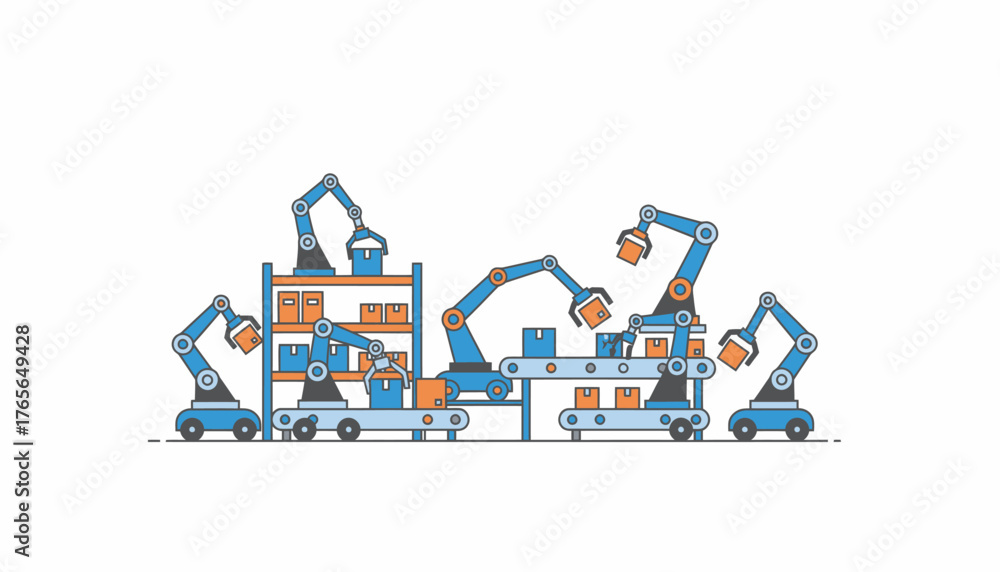 Robot arms and autonomous mobile robots sorting and loading cardboard boxes on conveyor belts in a smart factory, showcasing automated logistics and industry 4.0 efficiency #1765649428