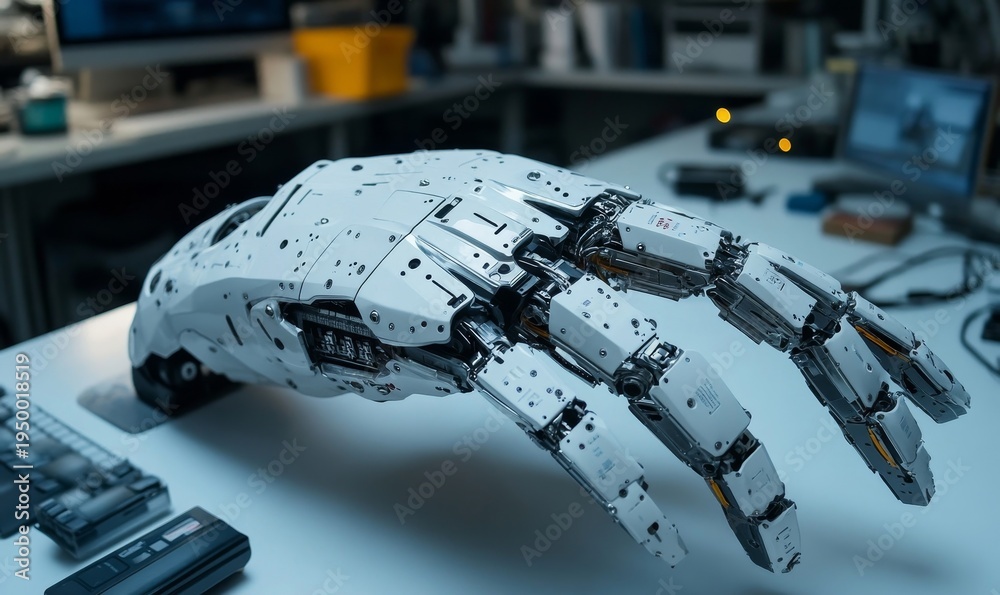 Robot hand designed for digital learning, representing futuristic industry, advanced machinery, and automation. Data science and technology modeling for engineering and android, Generative AI #1950018519