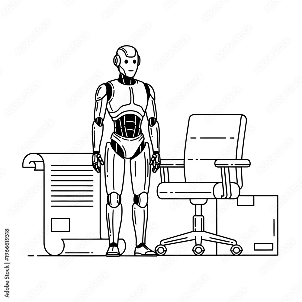 Robot standing next to a desk chair and blueprint in a professional office setting #1966619318