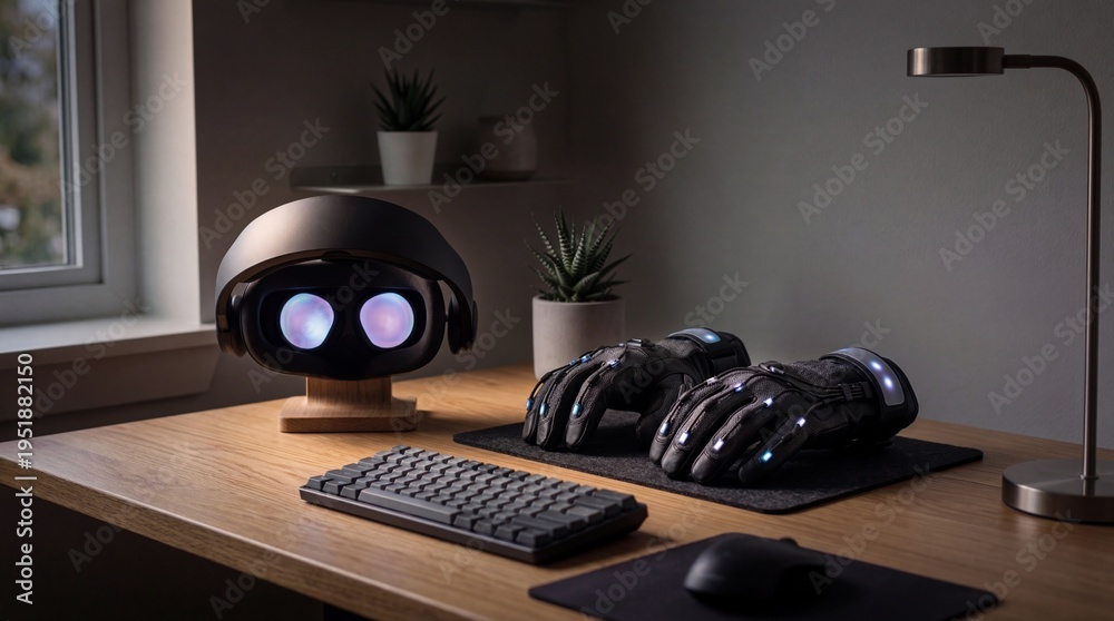 Robotic Hand Interacting with Modern Computer Setup on Home Office Desk #1951882150