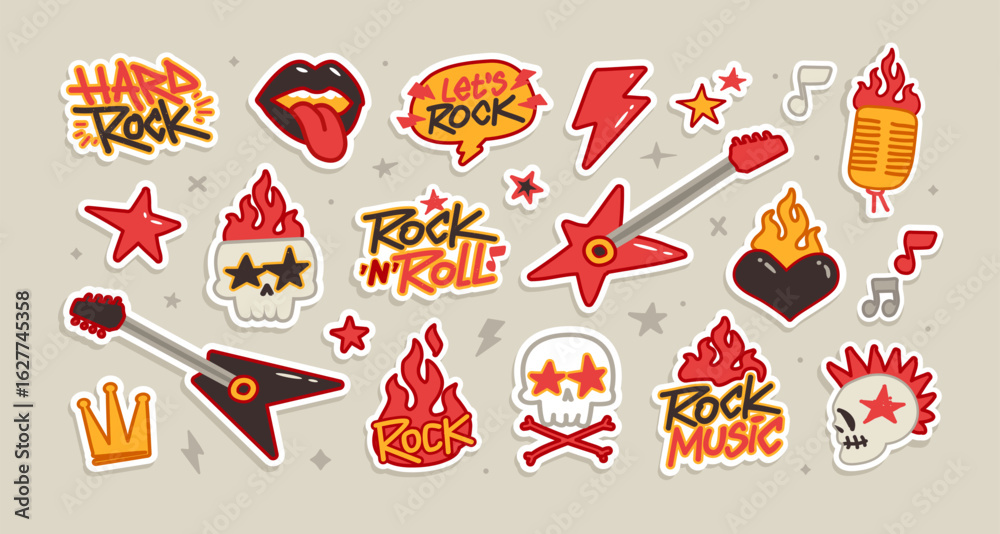 Rock and Roll Doodle Sticker Set – Punk, Skull, Guitar, Fire, Music Icons. Cool rock music doodle sticker set with skulls, guitars, flames, punk symbols. Perfect for music dsgn, apparel and merch #1627745358