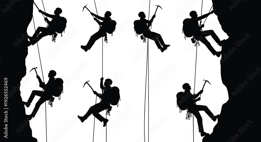 Rock climber rappelling and ascending cliff silhouette set with rope and ice axe isolated on white background for mountaineering adventure and extreme sport concept #1926552469