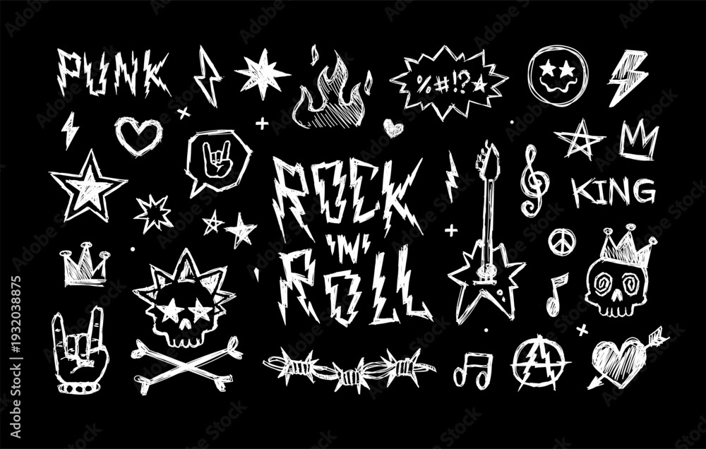 Rock'n'Roll music and Punk doodle signs, Hand dawn pattern elements in grunge style - editable vector set ( part 1 ) #1932038875