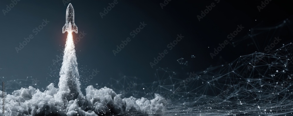 Rocket launch amidst digital mesh representing innovation and futuristic technology #1575733380