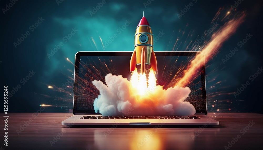 rocket launching from laptop with dramatic smoke for successful start up business concept #1253595240