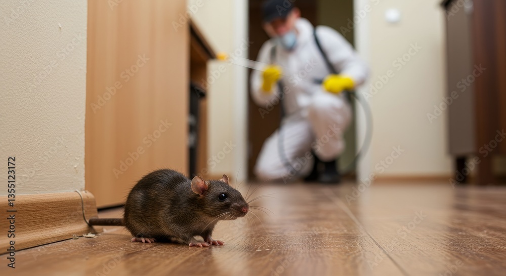 Rodent Control: Protecting Your Home from Pests - A rat in focus in a home setting, with a pest control professional blurred in the background, showcasing effective rodent removal services #1355123172
