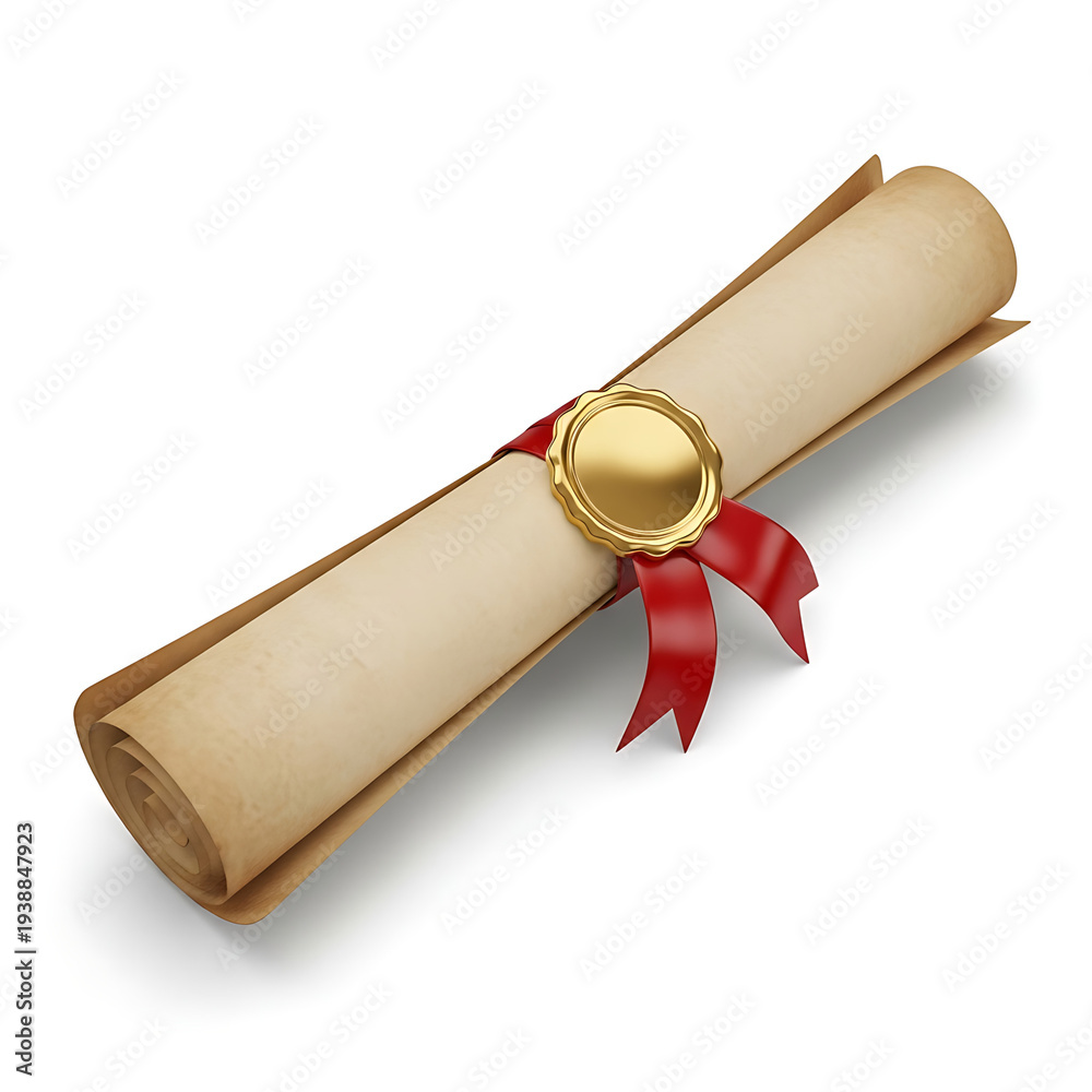 Rolled Diploma with Gold Seal and Red Ribbon Isolated on White Background #1938847923