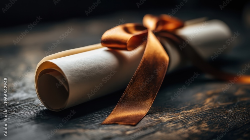 Rolled parchment with bronze ribbon and tied certificate scroll for elegant invitation background and banner design National Dissertation Day #1966542948