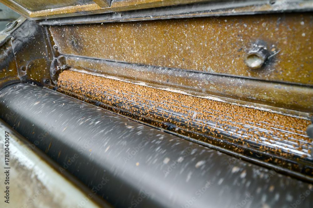 Roller mill flour milling machine in action producing fine flour from grain #1783043097