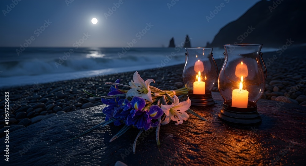 Romantic beach night with glowing candles and flower bouquet under full moon, serene ocean waves and dark coastal landscape, intimate love background with copy space for Valentine’s Day, wedding #1957223633