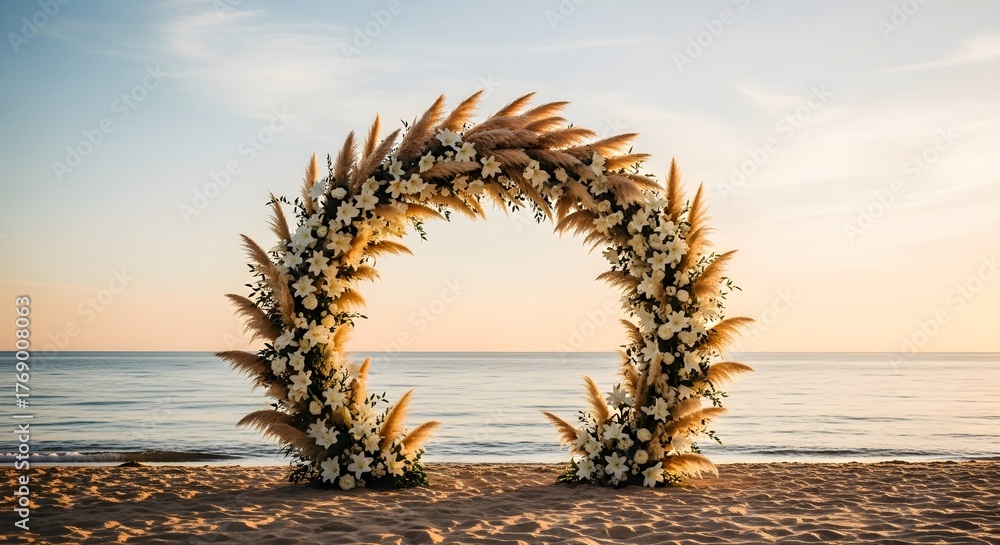 Romantic Beach Wedding Arch with White Flowers and Pampas Grass at Sunset: Destination Wedding Ceremony on Sandy Shoreline #1769008063