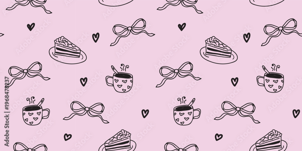 Romantic Coquette Pattern with Chocolate Cake Slices Pink Bows and Hearts #1968478237