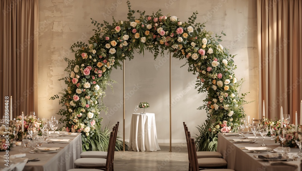 Romantic floral arch beside empty reception tables #1928954428