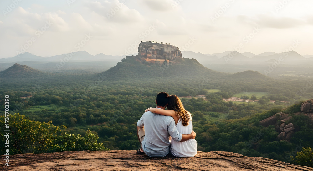 Romantic Getaway A Couple Embracing the Beauty of Nature Under the Warm Golden Sunset in Sri Lanka A Serene Moment of Love and Togetherness at Sigiriya Rock #1737703390