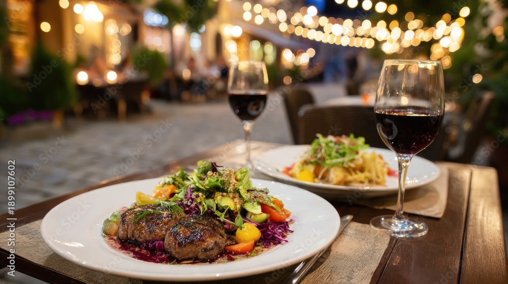 Romantic Outdoor Dining with Gourmet Dishes and Wine under String Lights #1899107602