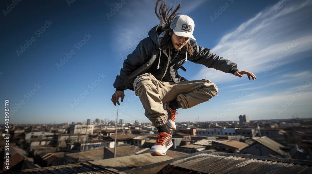 Rooftop adventure, parkour athlete's daring urban leaps. #648998170
