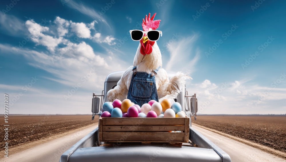 Rooster driving old pickup truck delivering easter eggs, wearing sunglasses and denim overalls on a rural farm road #1927771207