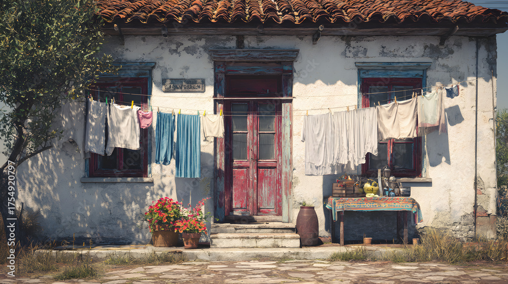 ropa colgada al sol afuera de una casa en un pueblo colgada en un tendedero para secar la ropa recien lavada para que seque con la exposicion al sol al aire libre #1754920797