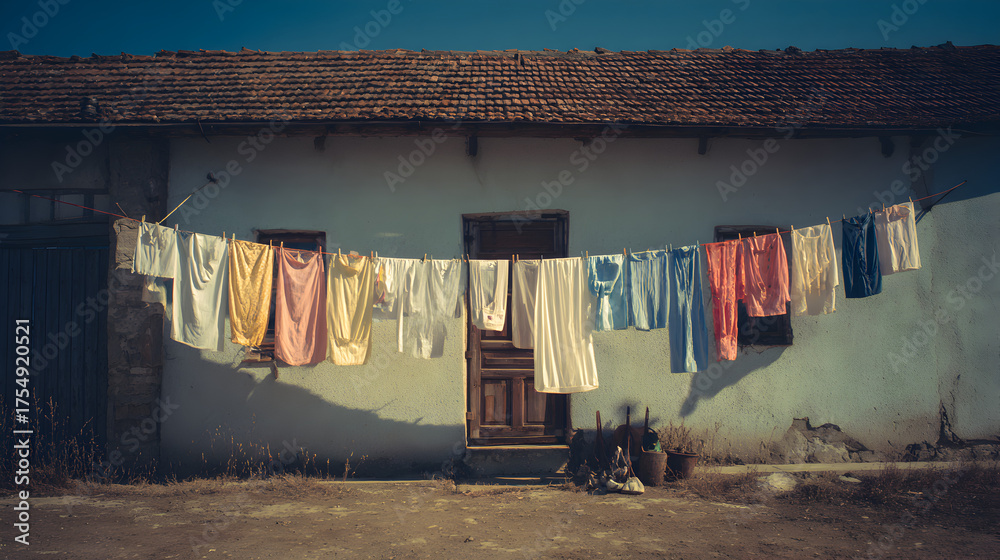 ropa colgando afuera de una casa rustica y humilde de un pueblo en el dia con el sol para secar la ropa humeda recien lavada #1754920521
