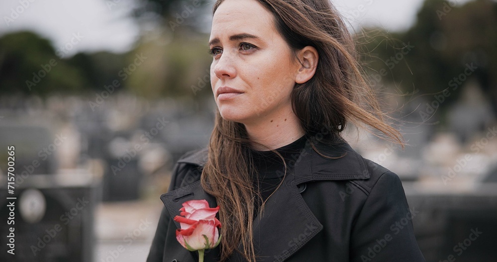 Rose, death or sad woman in graveyard for funeral. spiritual service or burial to respect the Christian religion. Mourning, depressed or person in cemetery thinking of grief, loss or goodbye farewell #715700265