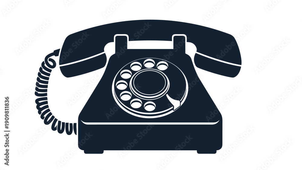 Rotary dial telephone silhouette in dark navy blue illustrates a classic vintage communication device in a bold graphic style. #1909811836