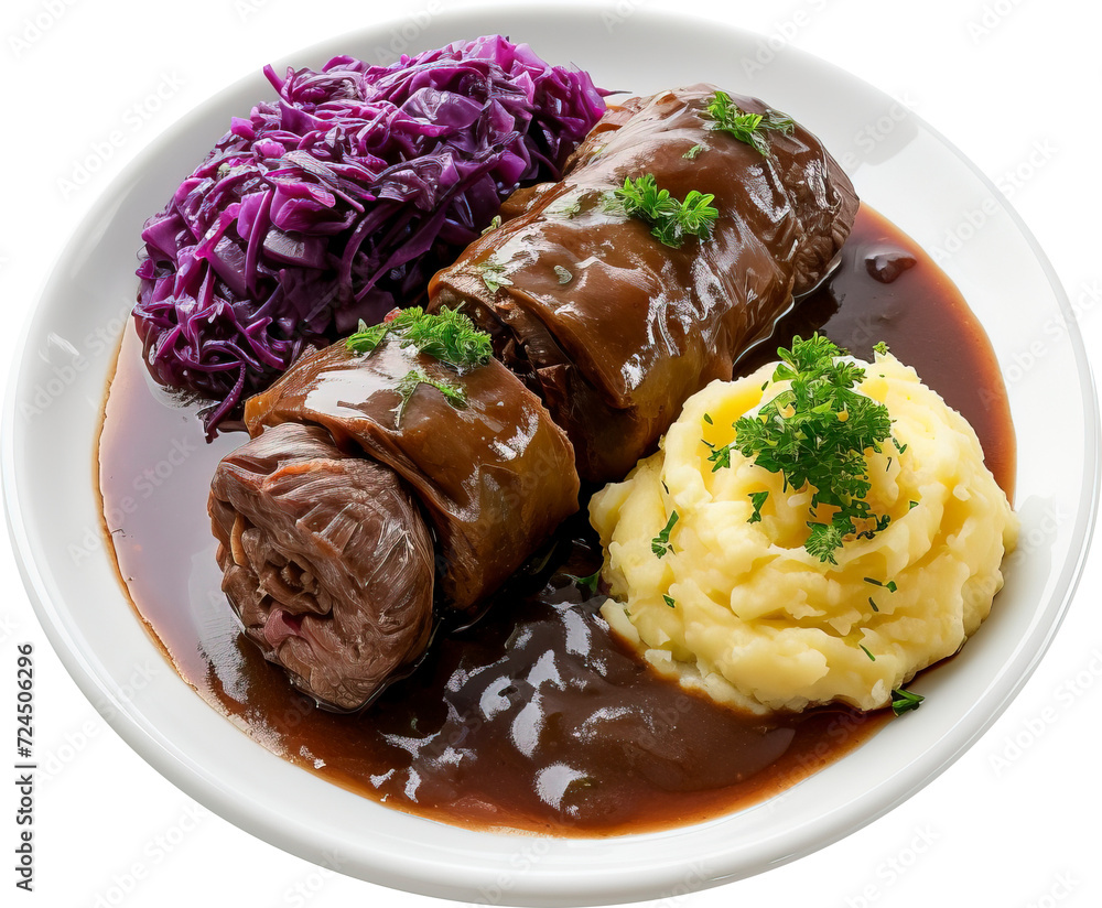 Rouladen with rolled and stuffed beef, bacon, and pickles in a rich gravy, served with red cabbage and mashed potatoes, isolated on transparent background. PNG #724506296