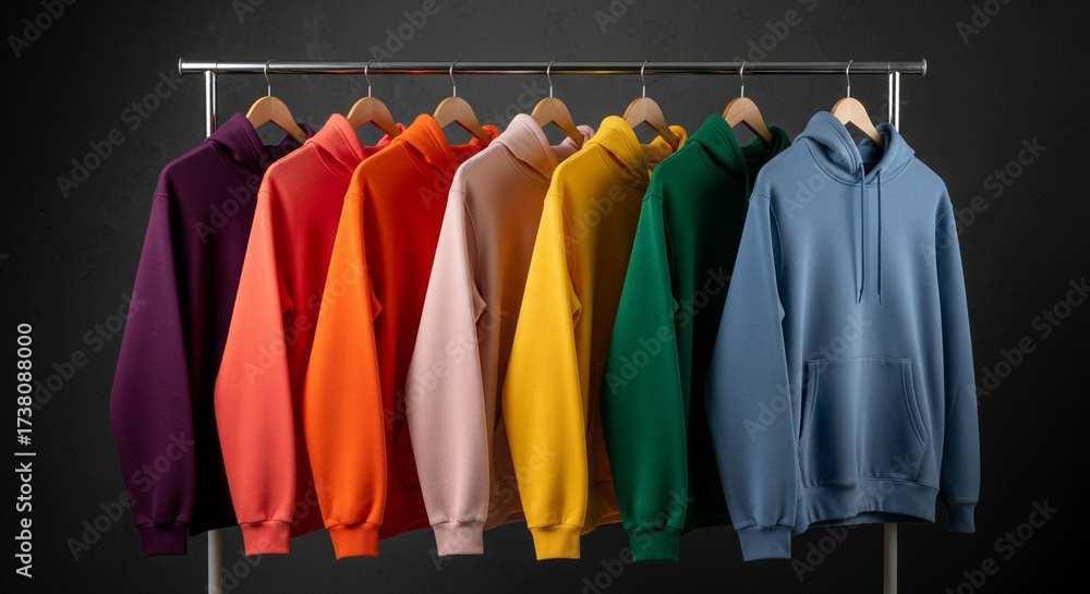 Row of colorful hoodies hanging on rack against black background, showcasing casual fashion and style for apparel design projects #1738088000