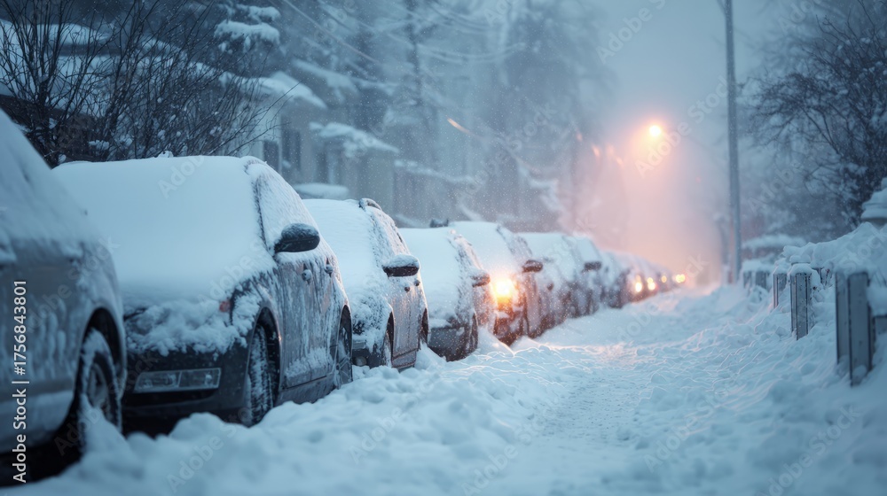 Row of parked cars covered in heavy snow during winter storm, capturing urban street scene with frosty vehicles, snowfall blankets, and cold seasonal atmosphere after a blizzard #1756843801