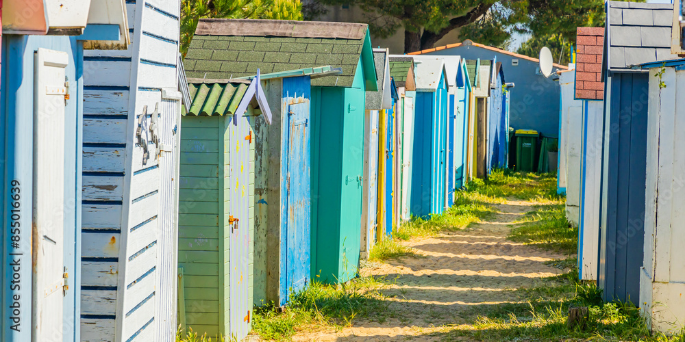 Row of small beach huts of La Boirie beach in Saint-Denis-d'Oleron, France #855016639