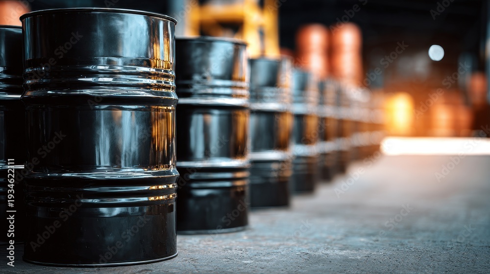 Rows of black oil drums in an industrial warehouse setting #1934622111