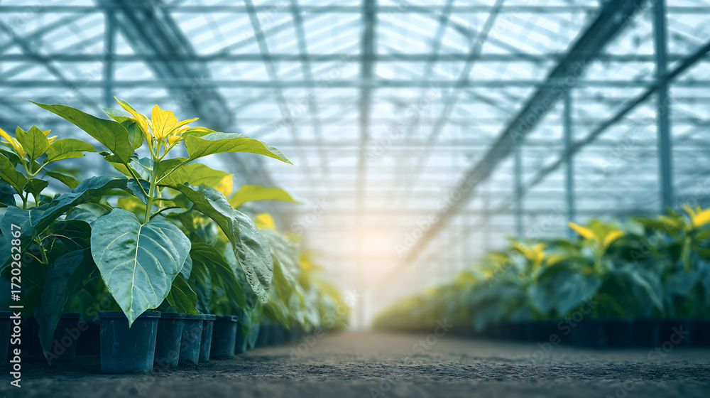 Rows of green plants growing in pots inside a large greenhouse with sunlight streaming through the glass roof #1720262867