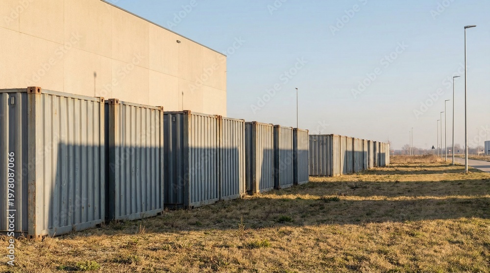 Rows of grey metal shipping containers near a warehouse building at sunset, industrial logistics and storage concept background. #1978087066