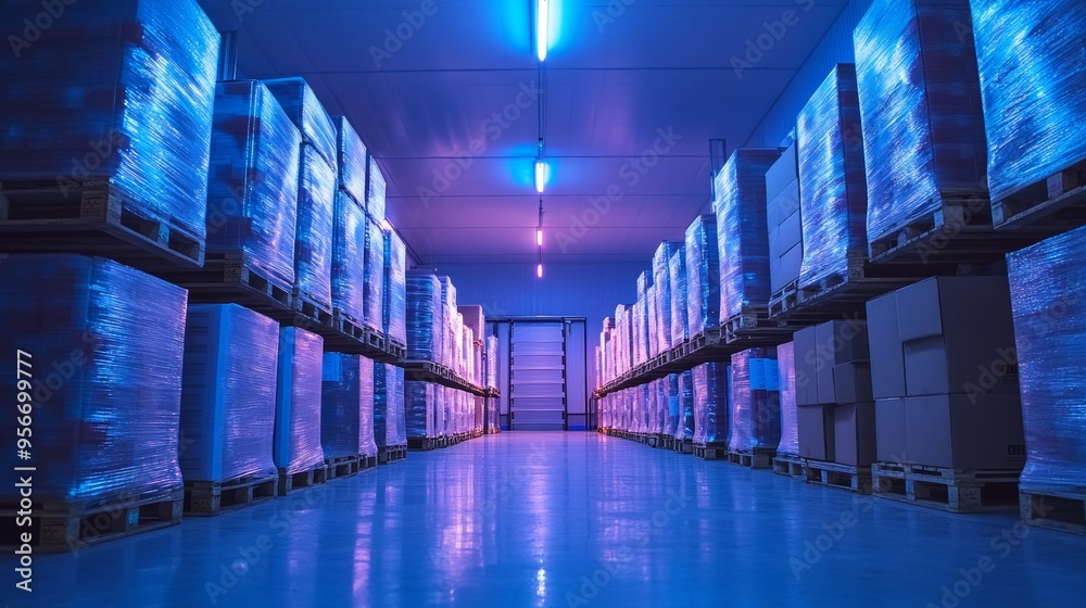 Rows of pallets piled with cardboard boxes inside an expansive cold storage, soft blue lighting reflecting off frozen surfaces, industrial shelving #956699777