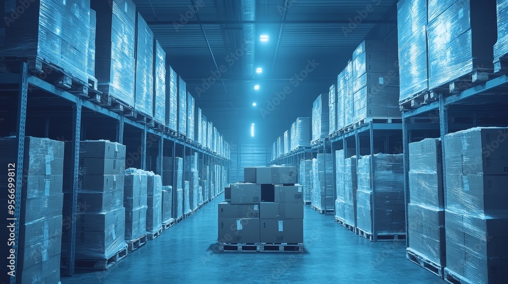 Rows of pallets piled with cardboard boxes inside an expansive cold storage, soft blue lighting reflecting off frozen surfaces, industrial shelving #956699812