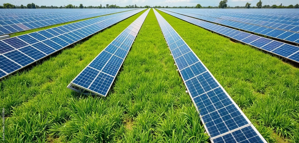 Rows of solar panels seamlessly integrated into a vibrant green lawn, power, green energy #1688470806