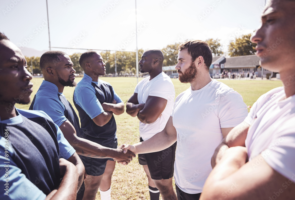 Rugby, men and handshake of team with confidence, sportsmanship or pride in competitive game. Fitness, sports and teamwork, proud players ready for match, workout or tournament on field at club #899246386