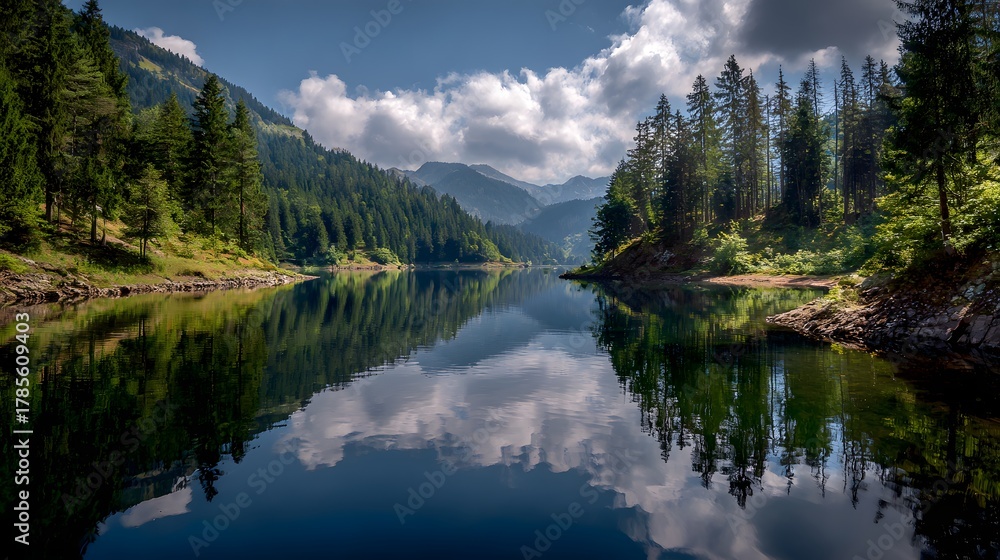 Ruhiger Bergsee mit Wolken und Waldspiegelung in klarer Bergluft #1785609403
