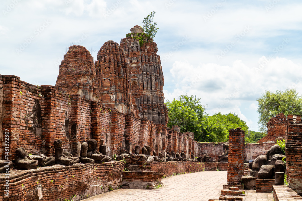 Ruins of the ancient temple of the ancient capital of Thailand, Ayutthaya, show weathered red bricks and rows of Buddha statues with beheaded figures, evoking history, loss, and sacred silence. #1431372307